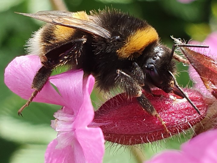 Drilling a hole in the Red Campion with its proboscis to get directly to the nectar